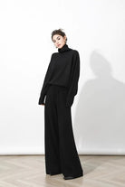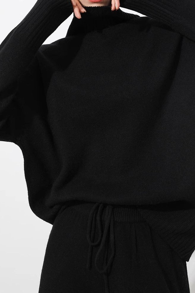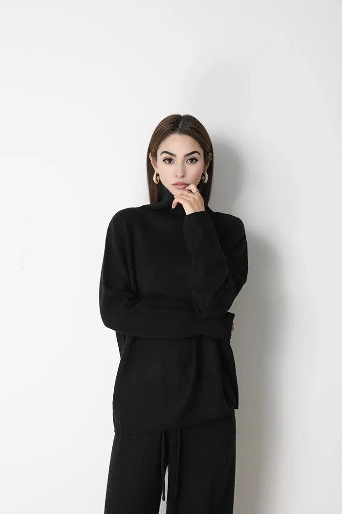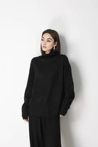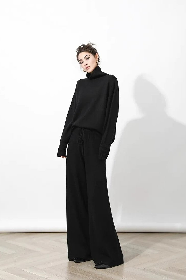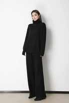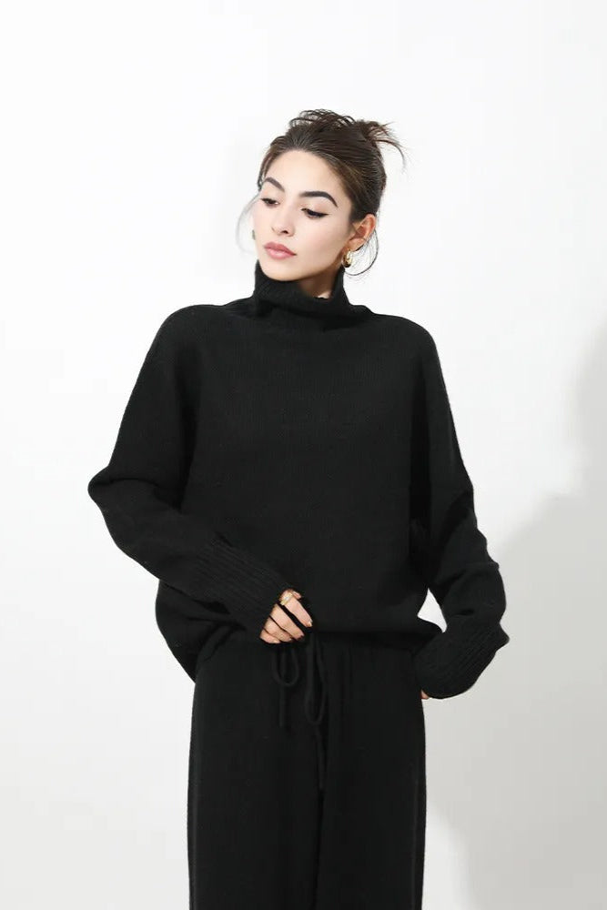 Wrap yourself in effortless sophistication with this oversized sweater, made from 100% wool. The high neckline and relaxed fit create a chic yet cozy silhouette, perfect for lounging or elevating your casual look. Ribbed cuffs add a subtle touch of texture, making this sweater a timeless wardrobe staple. Pair it with the matching wide-leg pants or mix and match for endless styling options.