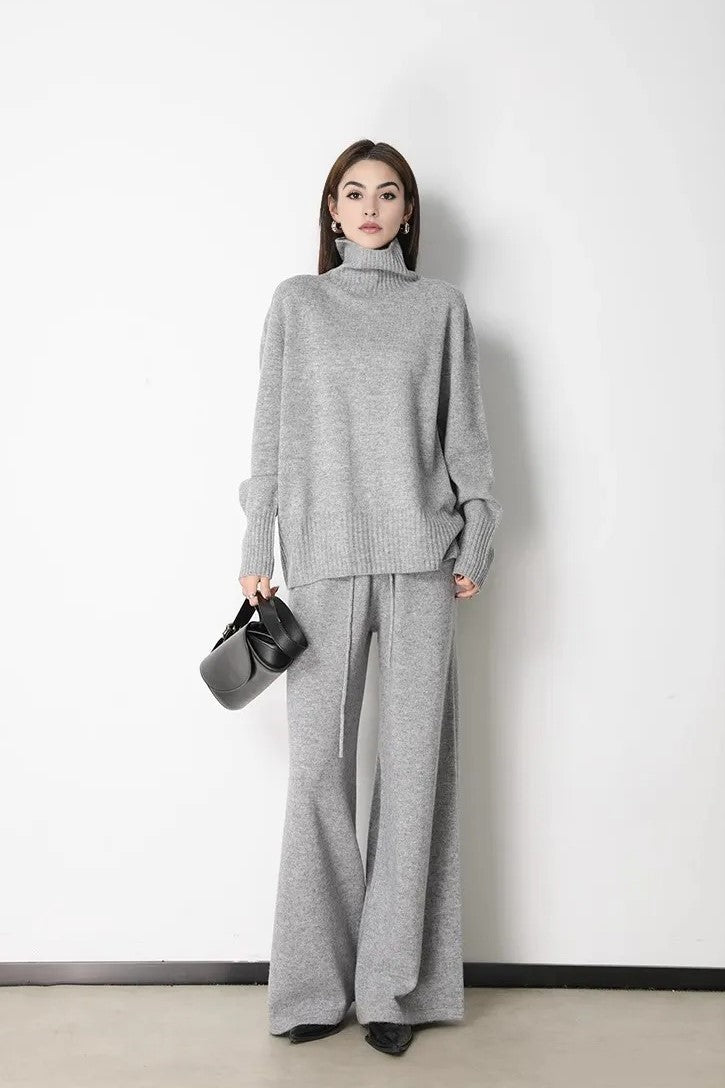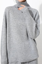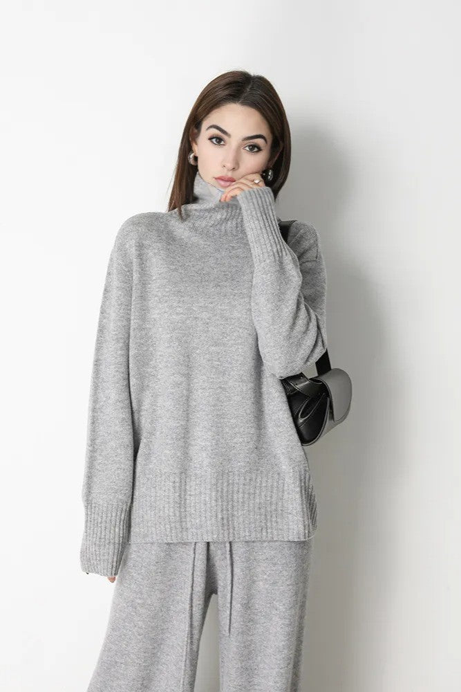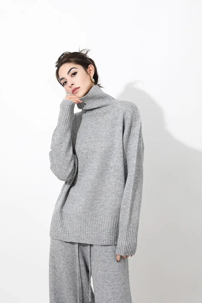 Wrap yourself in effortless sophistication with this oversized sweater, made from 100% wool. The high neckline and relaxed fit create a chic yet cozy silhouette, perfect for lounging or elevating your casual look. Ribbed cuffs add a subtle touch of texture, making this sweater a timeless wardrobe staple. Pair it with the matching wide-leg pants or mix and match for endless styling options.