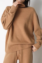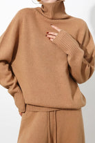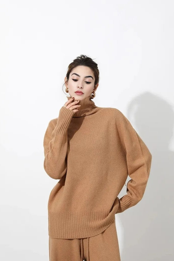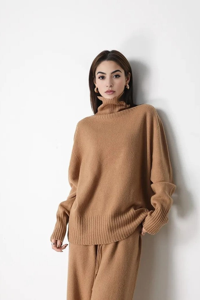 Wrap yourself in effortless sophistication with this oversized sweater, made from 100% wool. The high neckline and relaxed fit create a chic yet cozy silhouette, perfect for lounging or elevating your casual look. Ribbed cuffs add a subtle touch of texture, making this sweater a timeless wardrobe staple. Pair it with the matching wide-leg pants or mix and match for endless styling options.