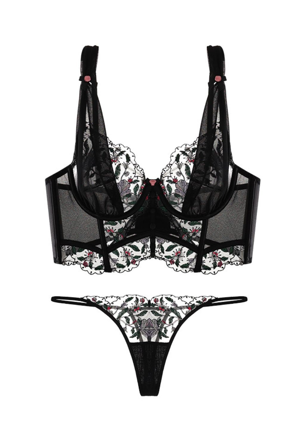 - Intricate floral embroidery on sheer mesh for a delicate yet bold look